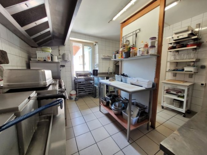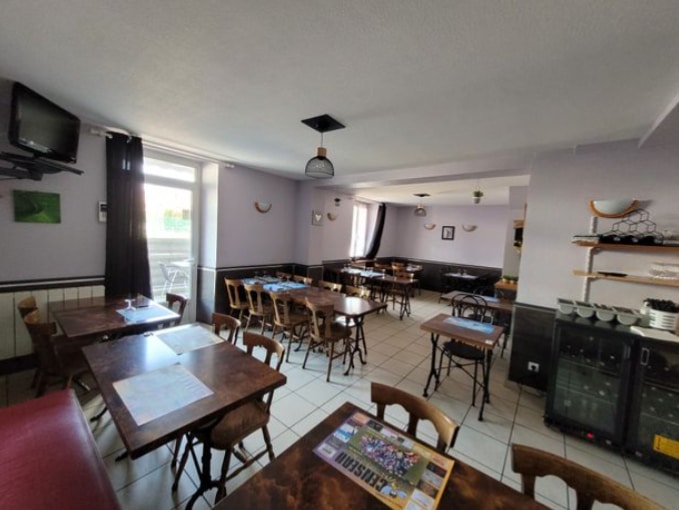 Deux salles de restaurant (50 couverts), un bar avec terrasse, cuisine professionnelle avec fenêtre et porte sur l’extérieur, bureau, toilette privé et sanitaire pour la clientèle.