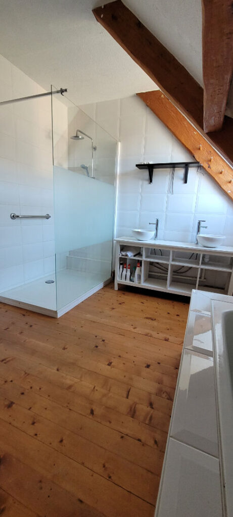 A l’étage, une grande mezzanine suivie d’un espace nuit de trois belles chambres, un bureau, un dressing, une salle de bain avec douche et un WC séparé, offrant tout le confort nécessaire à une grande famille.